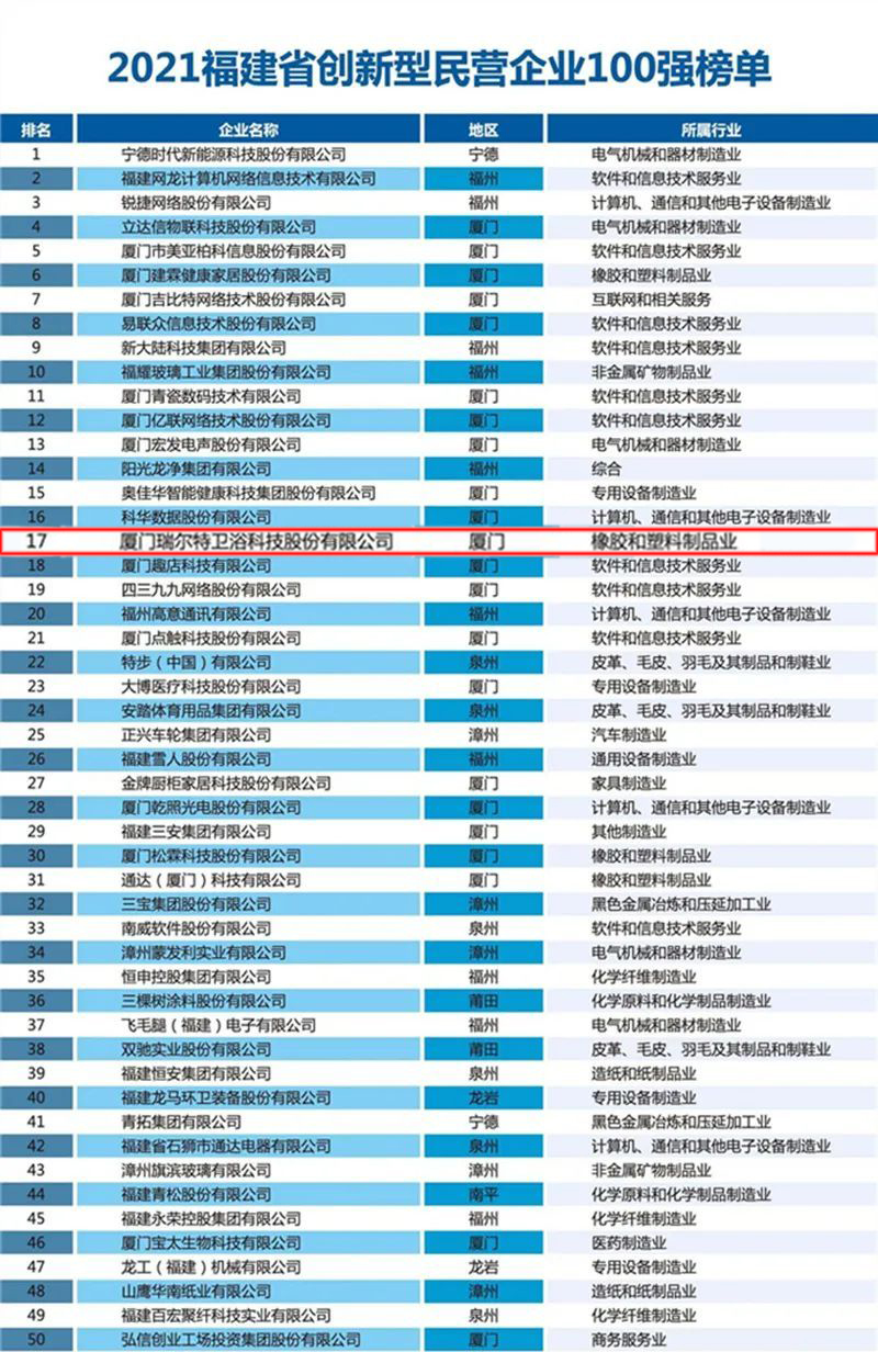 近日,福建省工商業(yè)聯(lián)合會首次發(fā)布2021福建省創(chuàng)新型民營企業(yè)100強(qiáng)榜單,廈門瑞爾特衛(wèi)浴科技股份有限公司憑借創(chuàng)新優(yōu)勢強(qiáng)勢上榜,位列第17位。